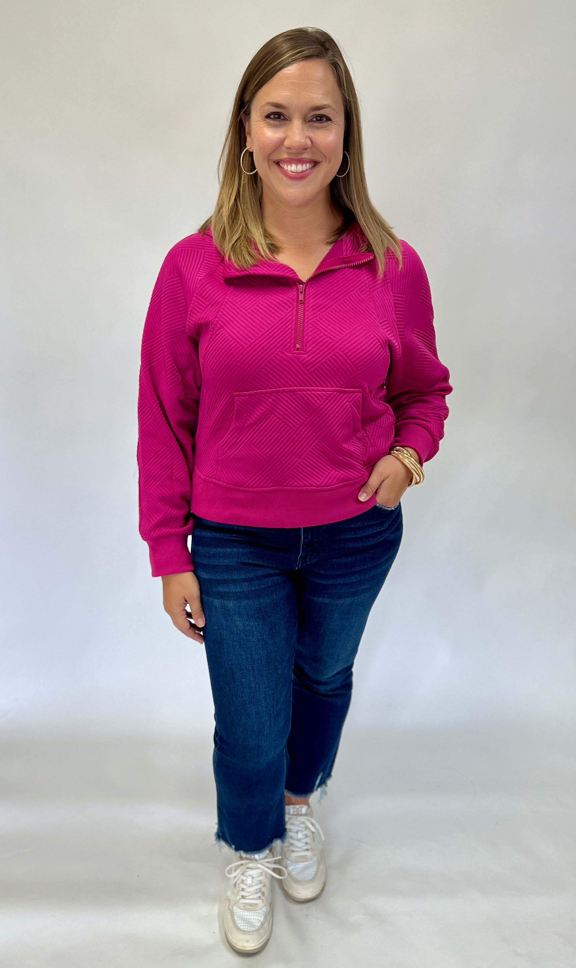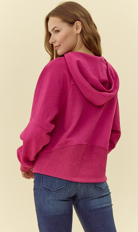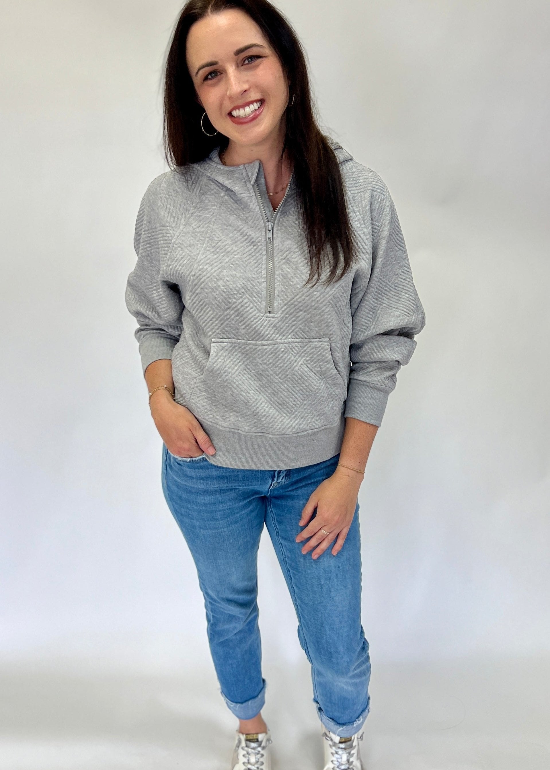 Meet your new go-to hoodie! Brooklynn is every bit as stylish as she is comfortable. Her textured knit adds a touch of personality, while her details have us falling even more in love with her. She's a half-zip hoodie with a kangaroo pocket and a flattering waistband that's slightly wider in the back. Her fit is true to size.