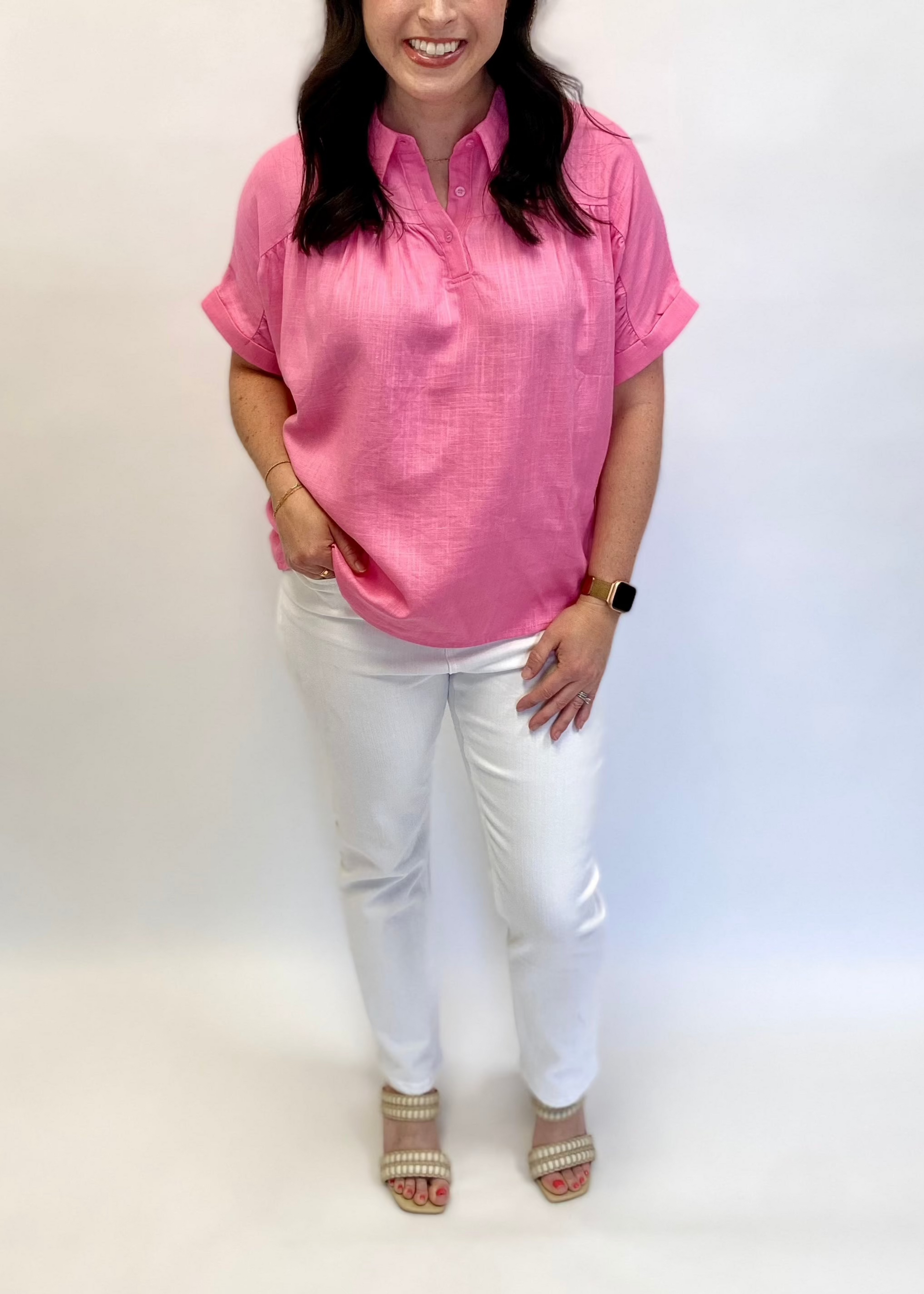 Add a touch of fun to your wardrobe with Cammy! Made from a luxurious linen blend woven fabric, this top features a unique collar neckline and playful dolman sleeves. Your new go-to for a casual and stylish look!