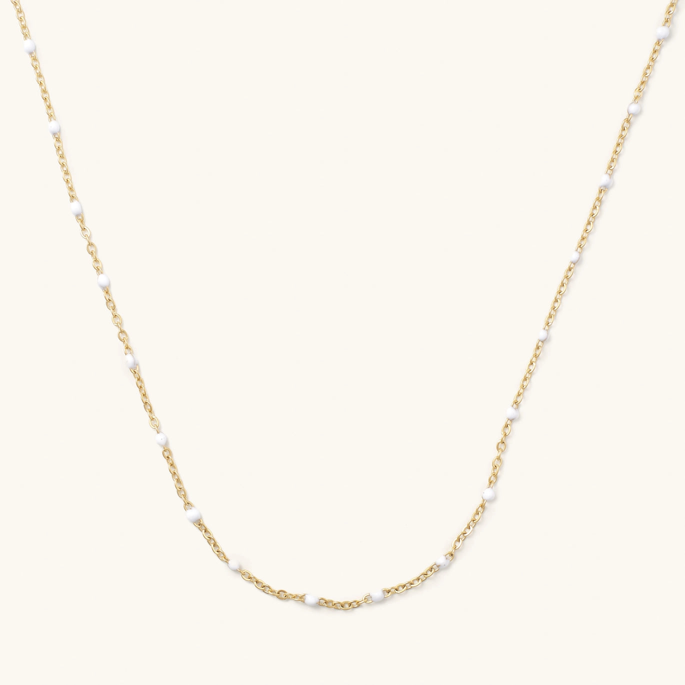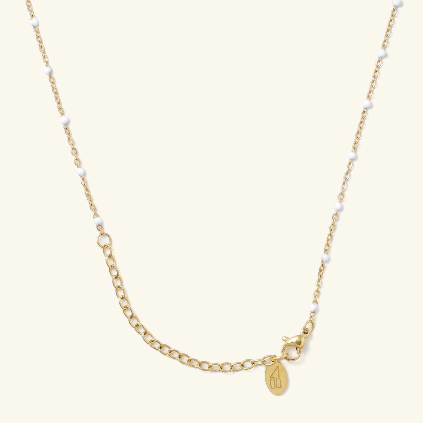This gold necklace features white beads throughout and is the perfect piece for layering!