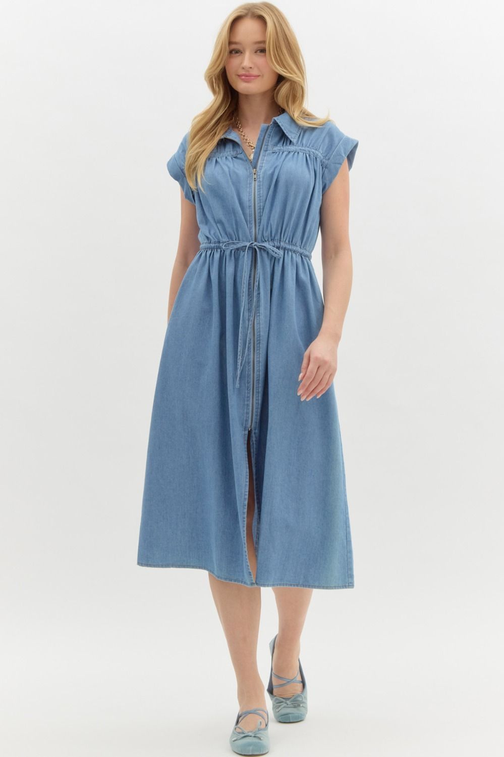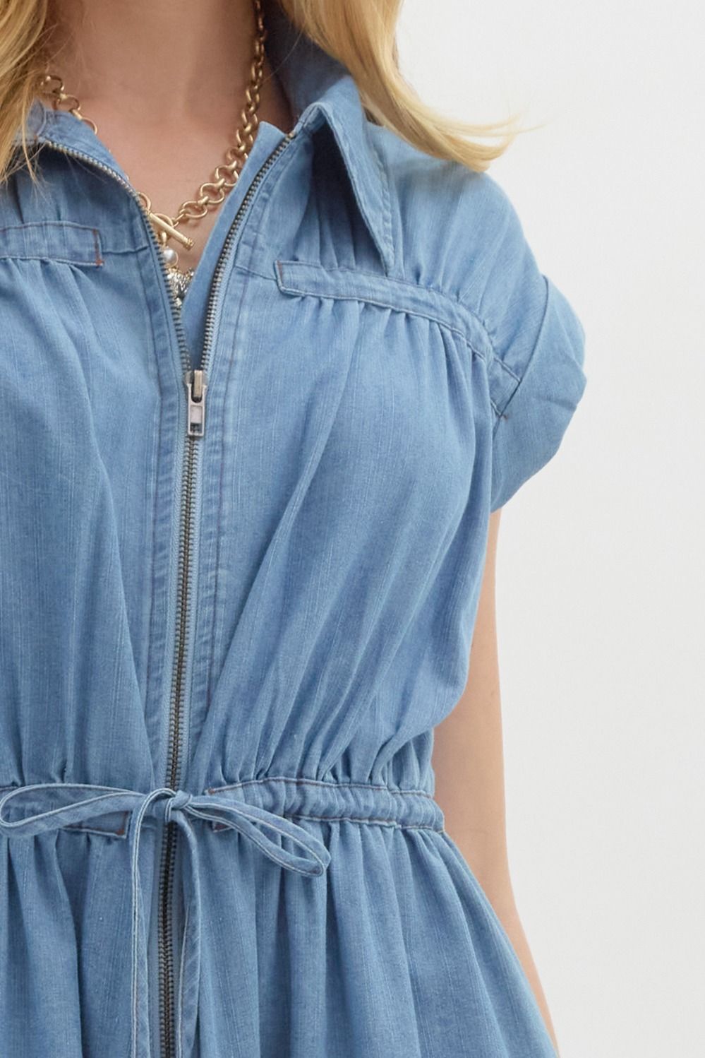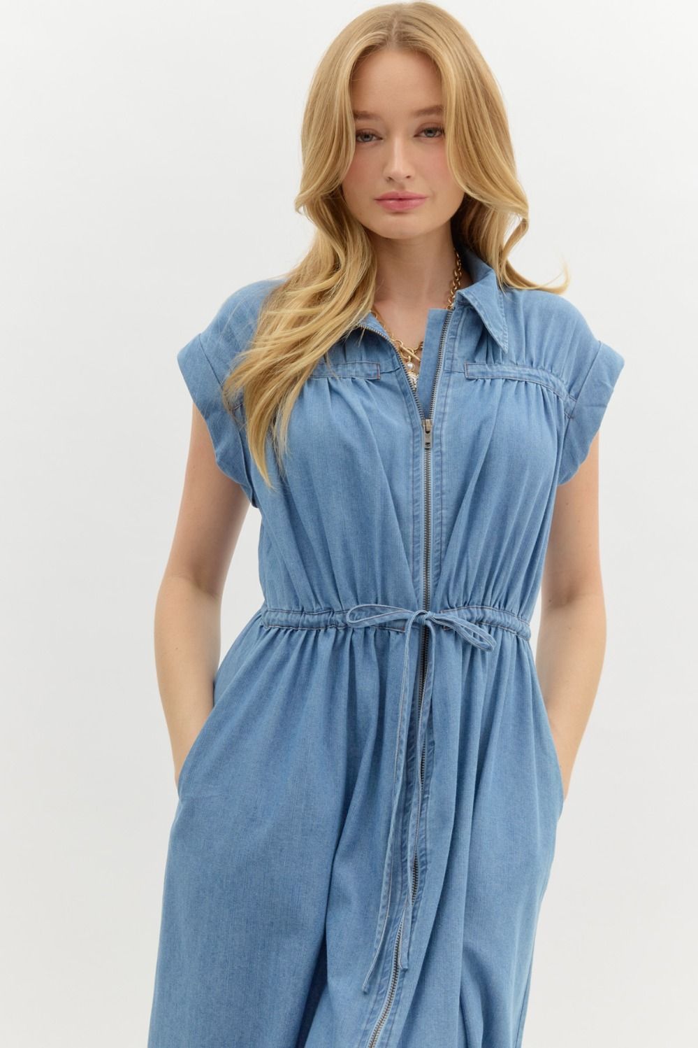 Casual yet effortlessly chic, Tara features cap sleeves and a ruched front for subtle texture and style. A front zipper closure and adjustable waist tie allow for a customized, flattering fit, while side pockets add practical convenience. Crafted from lightweight woven denim, this non-sheer, unlined dress is perfect for all-day comfort and versatile wear.