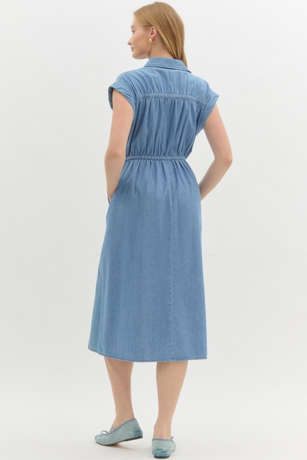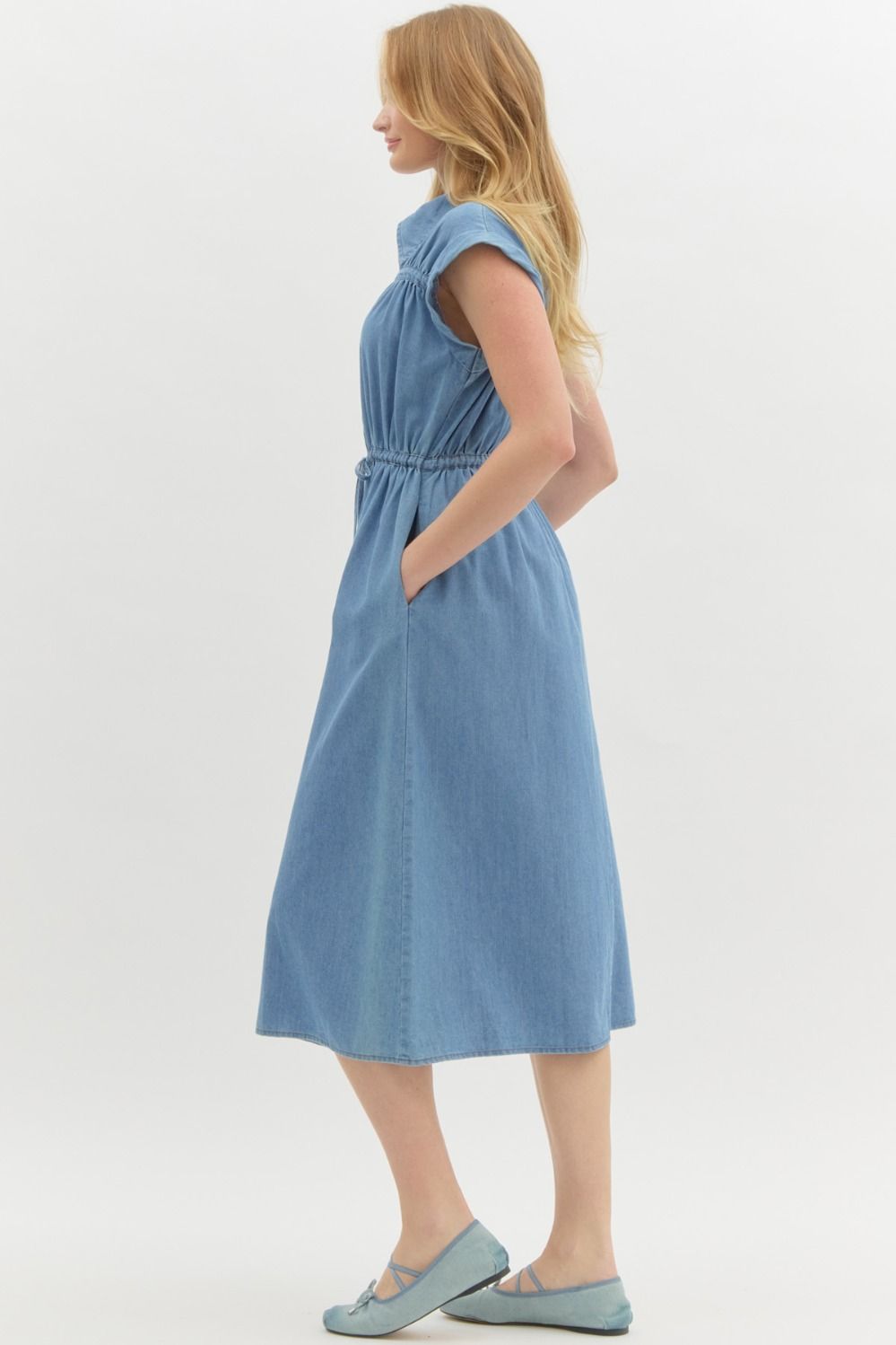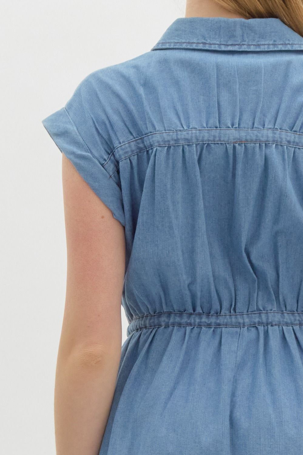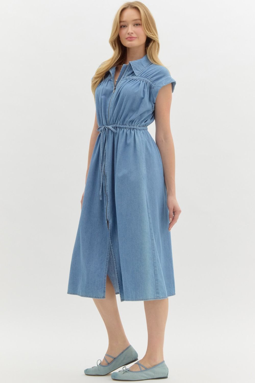 Casual yet effortlessly chic, Tara features cap sleeves and a ruched front for subtle texture and style. A front zipper closure and adjustable waist tie allow for a customized, flattering fit, while side pockets add practical convenience. Crafted from lightweight woven denim, this non-sheer, unlined dress is perfect for all-day comfort and versatile wear.