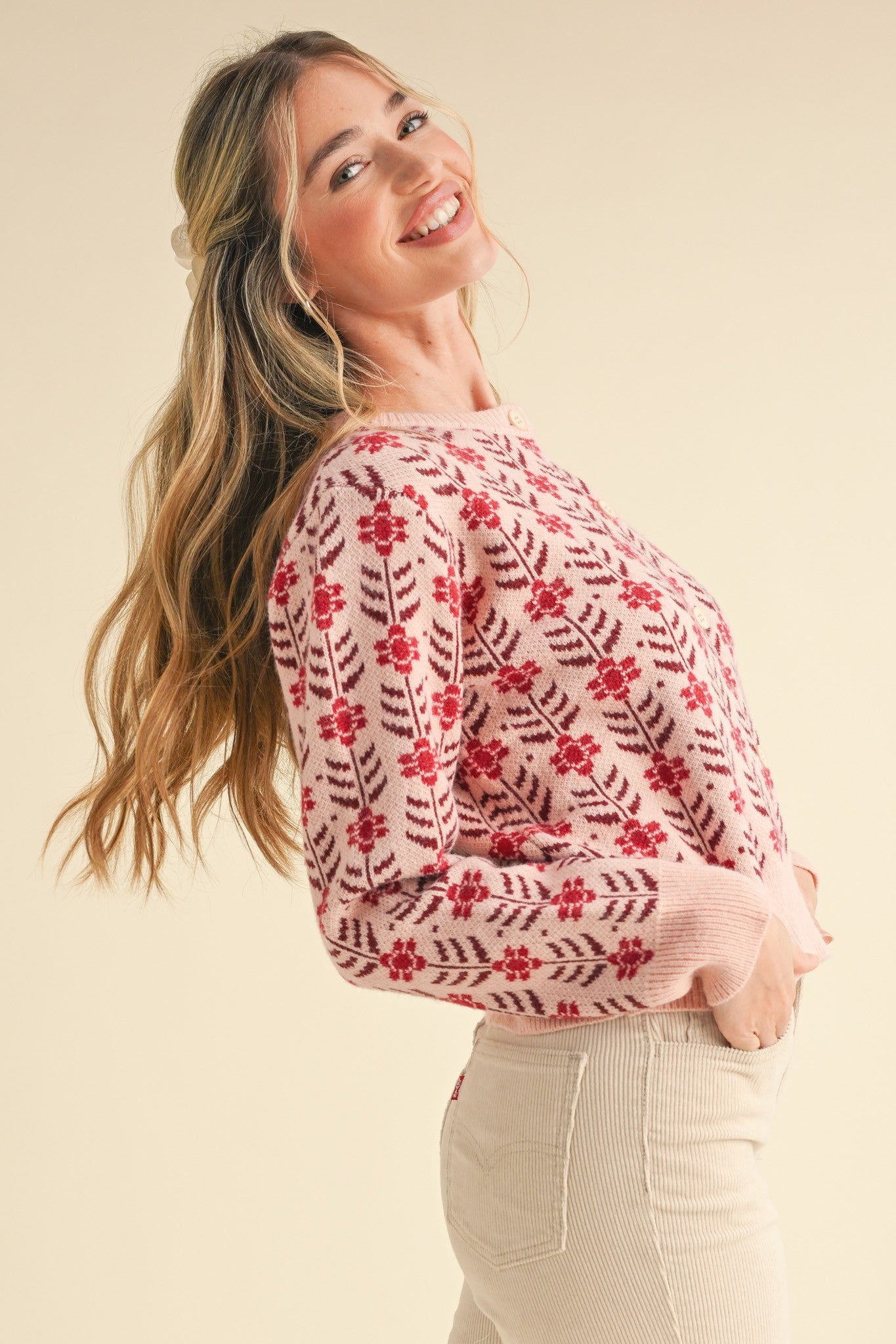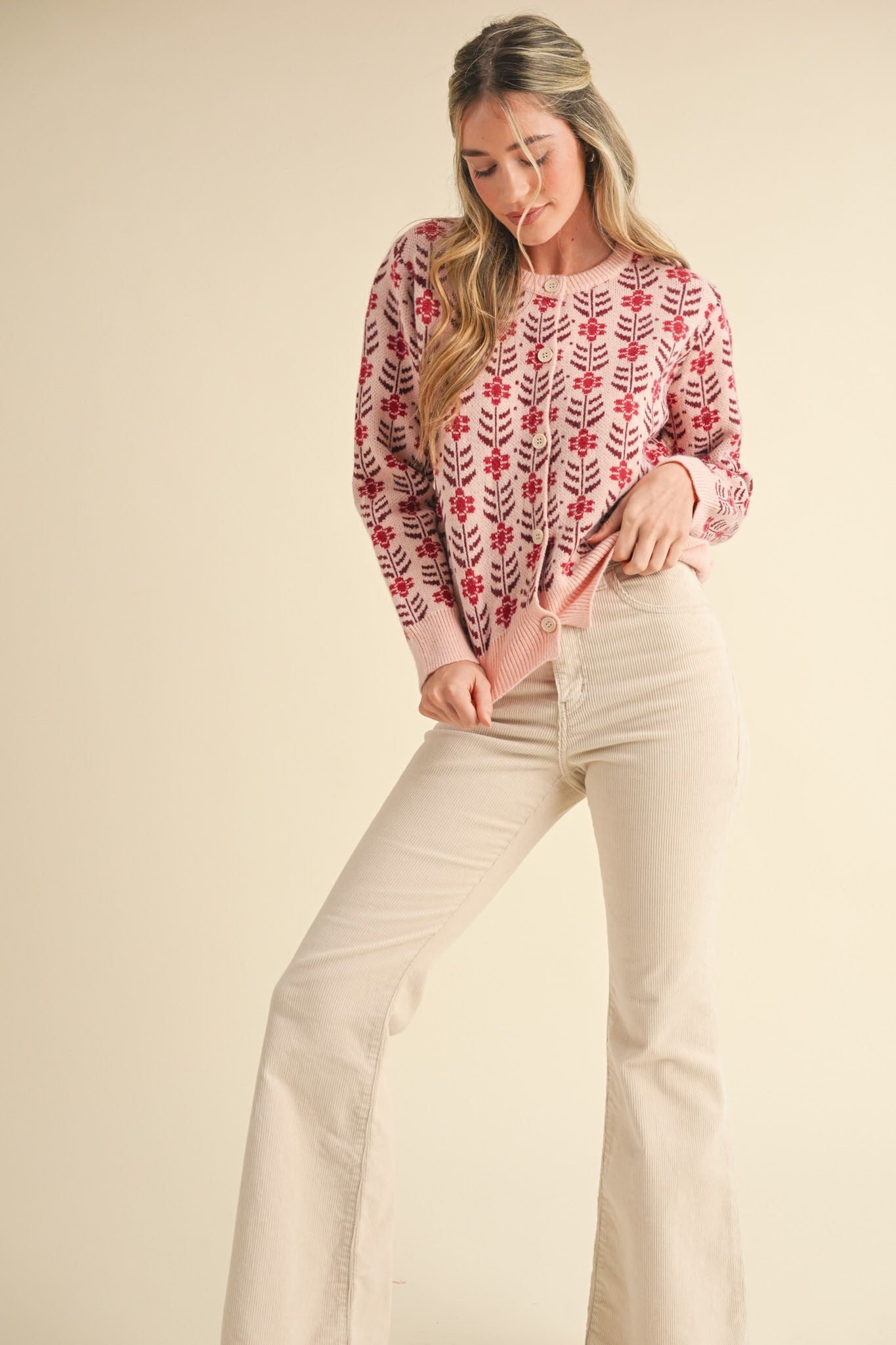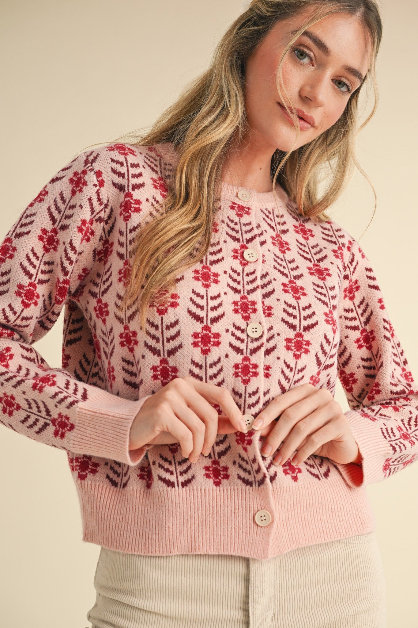 Add a touch of whimsy to your wardrobe with our Mona Floral Cardigan. This button-up sweater features a unique floral pattern and contrast ribbed details for a playful twist on a classic style. It's heavier weight makes it perfect for this cold blast, and its waist-length fit will flatter any figure. Say hello to your new favorite cardigan!