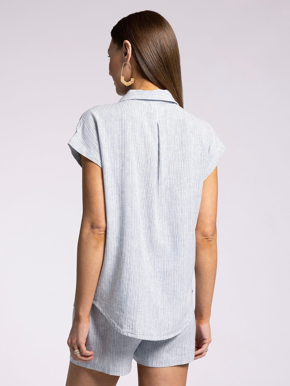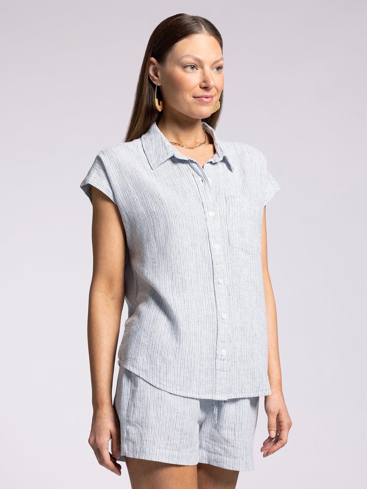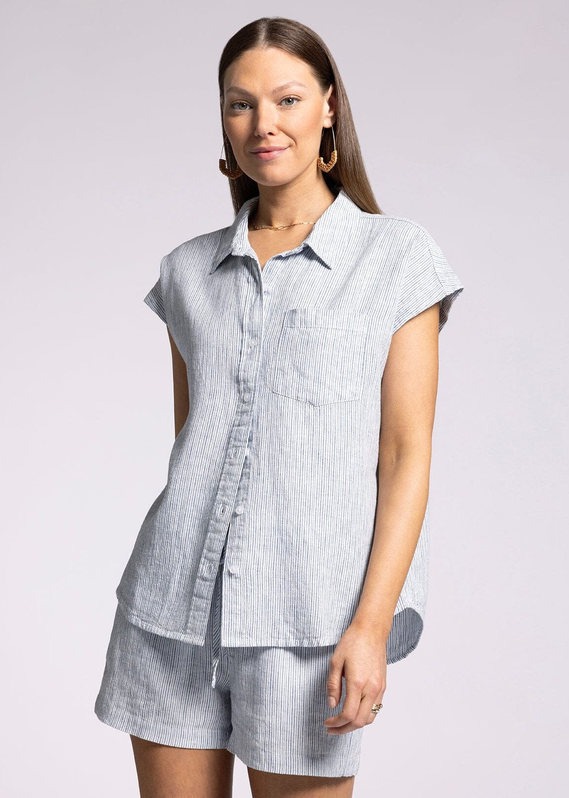 The Mali Shirt features a collared neckline, cap sleeves, and a button front closure for a comfortable and stylish fit. With a single chest pocket, this shirt is perfect for casual spring and summer days.