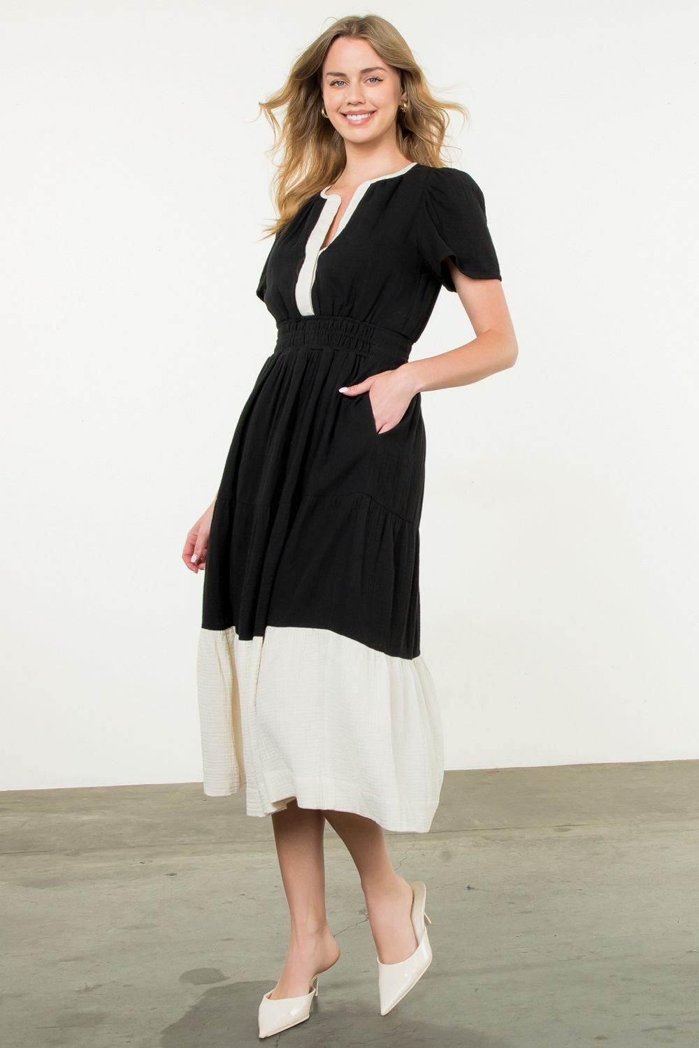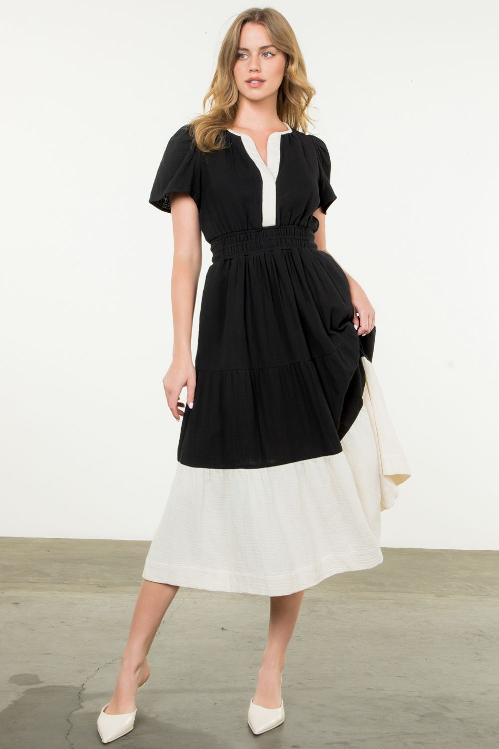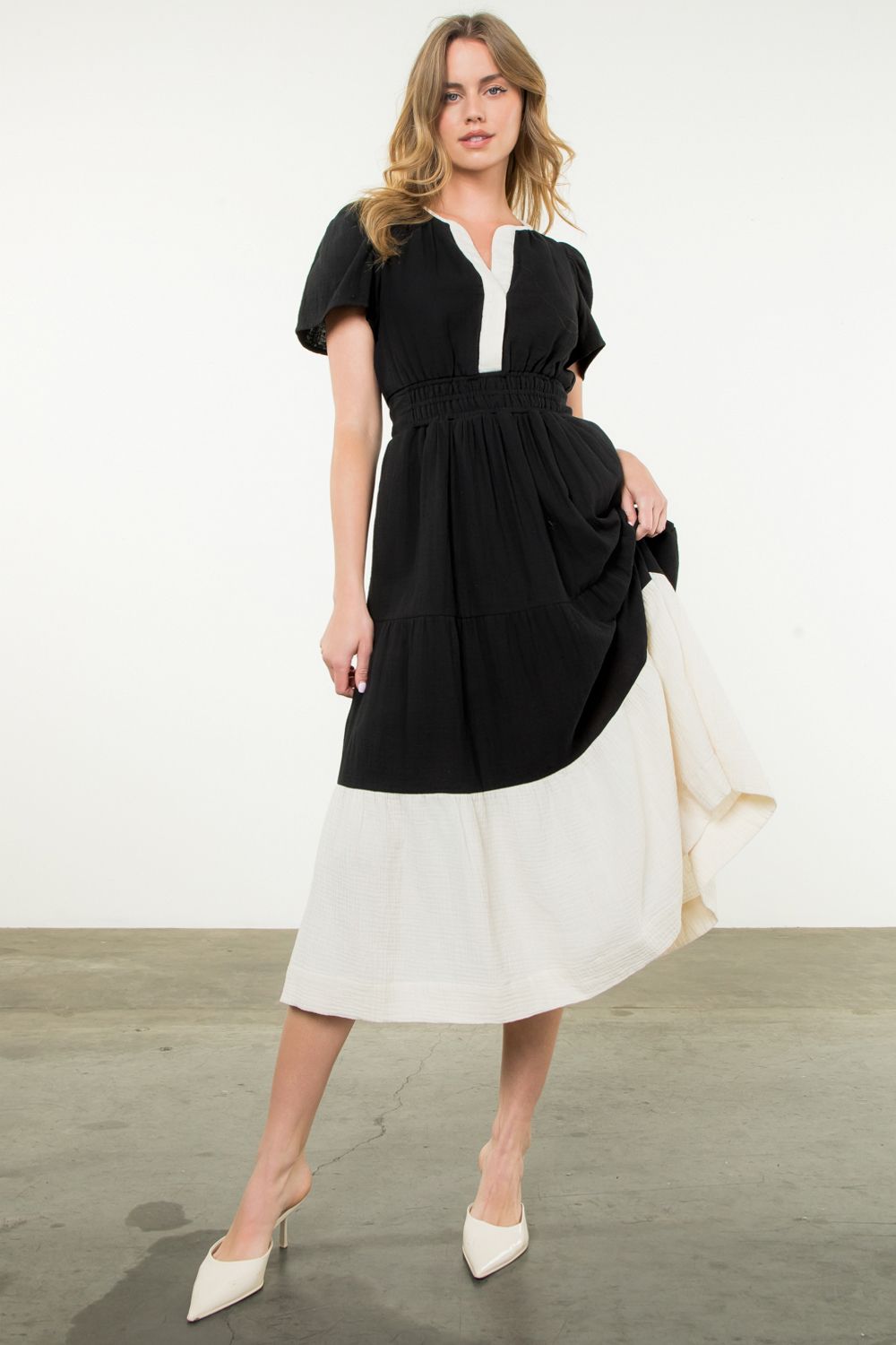 Elevate your everyday style with this chic black midi dress, featuring a contrast cream hem and neckline for a modern twist. The elastic waistband provides a flattering fit, while the flowy skirt and short sleeves add effortless comfort. Perfect for both casual outings and dressier occasions!